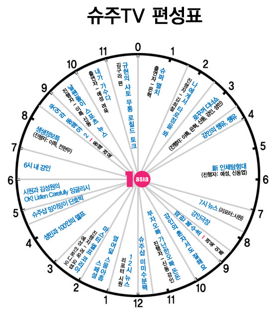 아이돌이지만 아이돌 같지 않다. 항상 다른 아이돌과 비교하기 힘든 독특한 위치에 있어온 슈퍼주니어는 멤버 중 일부가 자리를 비우고 사고가 나도 7년간 여러 멤버의 개성을 다양한 능력으로 다져왔다. 특히 예능에서의 존재감은 누구를 부르든 몇 명을 모으든 ‘큰 웃음’을 보장해 소위 믿고 볼 수 있게 한다. 지난 2회에 걸쳐 방송된 MBC <황금어장> ‘라디오 스타’(이하 ‘라스’)는 오랜만에 이러한 슈퍼주니어의 장점을 상기시켰다. 서로를 공격하다가도 토론하고 다독이면서 이들은 정말 슈퍼맨처럼 거의 모든 장르를 섭렵할 수 있을 듯 보였다. 그래서 준비했다. 아래는 하루 종일 시청자에게 즐거움을 주길 바라는 마음으로 만든 일명 ‘슈주 TV’ 편성표다. 그 중 메인 프로그램 9개의 기획의도 및 세부 내용도 소개한다. 이 중 당신이 오늘 본방 사수하고 싶은 프로그램은 무엇인가. 다시 보기 및 다운로드 서비스는 불가하니 신중하게 고르길 바란다.