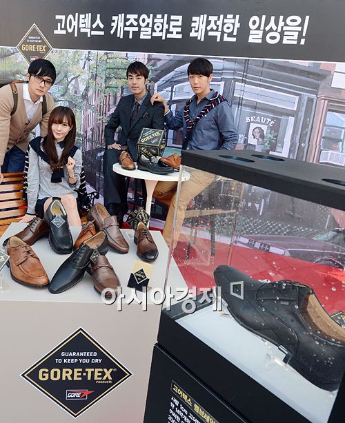 [아시아경제 정재훈 기자] (주)고어코리아가 20일 오전 청계광장에서 견고한 방수성과 뛰어난 투습성에 편안한 착용감을 더한 고어텍스 캐주얼화를 소개하고 있다.