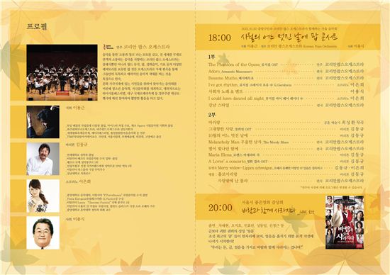 공연은 파주필하모닉 오케스트라 상임지휘자인 이용근씨 지휘로 코리안팝스오케스트라가 잘 알려진 뮤지컬‘오페라의 유령’을 시작으로 ‘아도로’, ‘베사메무초’등 가을밤의 정취에 어울리는 서정적인 곡들을 연주한다.