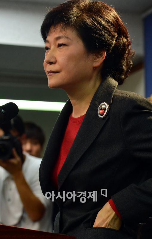 [아시아경제 최우창 기자]새누리당 박근혜 대선후보가 21일 여의도 당사에서 정수장학회 논란과 관련 입장을 발표하고 있는 가운데 손을 넣고 있다.