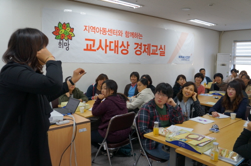 공부방 교사 경제 교실은 놀이를 통한 다양하고 재미있는 경제교육 방법을 제안한다. 참가자 연령에 따라 맞춤 개발한 눈높이 보드게임은 각국의 화폐를 구분하고, 저축과 투자의 개념과 펀드·부동산의 특징을 자연스럽게 파악할 수 있어 교사들이 공부방 어린이들과 재미있고 쉽게 경제를 배울 수 있다. 또한 주사위 게임과 스피드 게임 등 흥미로운 교육 방법도 소개하고 있어 참가한 교사들에게 좋은 반응을 얻었다.