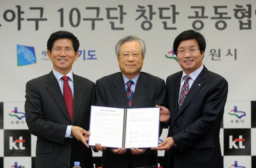 경기도와 수원시는 6일 오후 2시 수원시 매산로3가 경기도청 상황실에서 김문수 경기도지사, 염태영 수원시장, 이석채 KT 회장 등이 참석한 가운데 프로야구 10구단 창단 협약식을 가졌다.