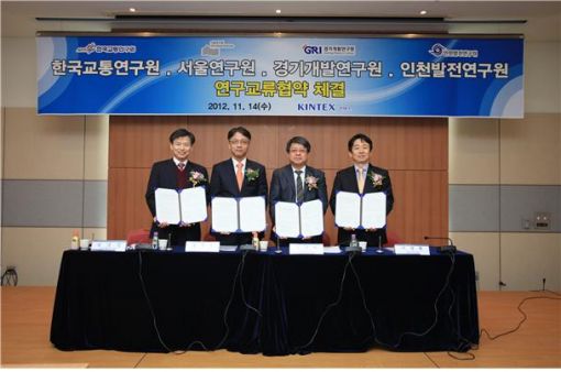 【수원=이영규 기자】경기개발연구원(원장 홍순영)이 수도권 교통발전 연구 및 학술활동 교류 추진을 위해 14일 일산 킨텍스에서 인천발전연구원, 서울연구원, 한국교통연구원과 업무협약(사진)을 체결했다.