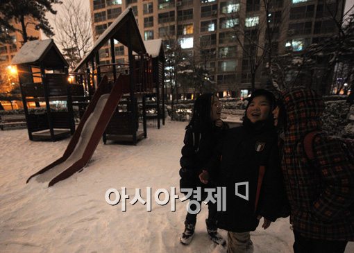 [아시아경제 백소아 인턴 기자] 하루종일 오락가락 눈이 내린 7일 서울 영등포구 한 아파트 놀이터에서 어린이들이 즐거운 시간을 보내고 있다.