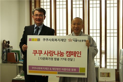 전달식에는 허재영 쿠쿠전자 이사와 공익법인 아름다운동행의 사무총장 혜일 스님이 참석했다. 쿠쿠전자는 이날 서울 지역의 밥솥이 필요한 다문화가정 77곳에 IH전기압력밥솥을 전달했다.