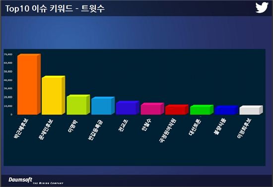 트위터와 소셜미디어 분석업체 다음소프트는 대선 후보 TV토론 트윗 단어를 분석한 결과 ‘박근혜 후보’가 33%를 차지했다고 17일 발표했다.