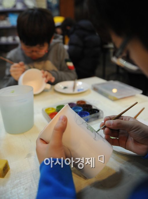 [아시아경제 백소아 기자] 한낮 기온이 영하 9도를 기록한 2일 서울 종로구 인사동 쌈지길에 방학을 맞은 어린이들이 체험공방에서 도자기 공예를 체험하고 있다.