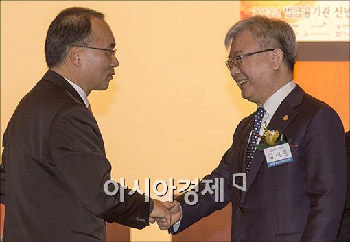 [아시아경제 윤동주 기자] 3일 서울 중구 소공동 롯데호텔에서 열린 범금융기관 신년인사회에 참석한 박재완(왼쪽) 기획재정부 장관이 김석동 금융위원장과 인사.