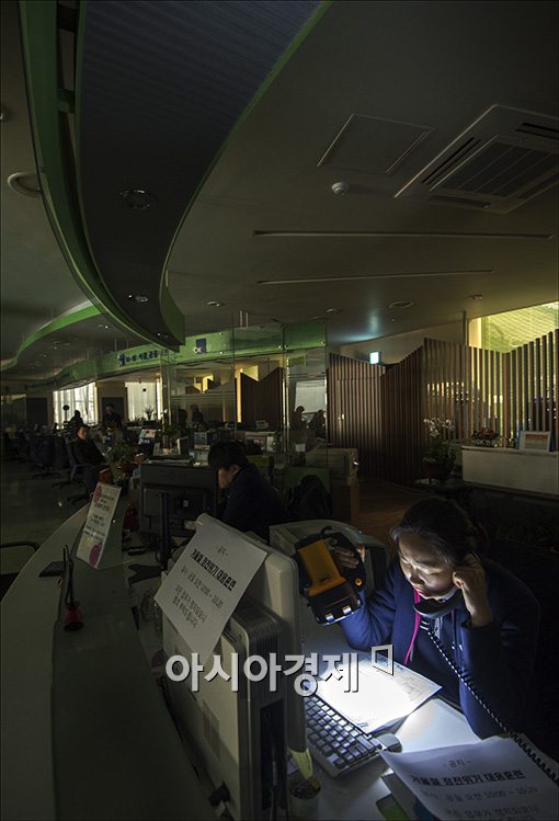 [아시아경제 윤동주 기자] 정전대비 위기 대응 훈련이 전국적으로 실시된 10일 서울 서초구청 OK 민원센터 공무원들이 LED 비상 렌턴을 이용해 민원 처리 및 응대.