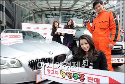[아시아경제 최우창 기자]오픈마켓 11번가가 무형상품 전문몰인 타운 11번가를 통해 '중고차 할인 쿠폰 기획전'을 알리는 미디어 행사를 개최, 20일 오전 서울 광화문 일민미술관 앞에서 모델들이 홍보하고 있다.