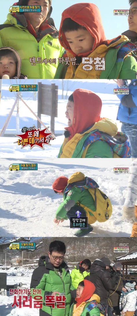 20일 방송된 MBC '일밤-아빠! 어디가?'에서는 성동일-준(7), 김성주-민국(9), 이종혁-준수(6), 송종국-지아(6), 윤민수-후(7) 다섯 가족이 충청북도 두모리에서 두 번째 여정을 시작했다.
