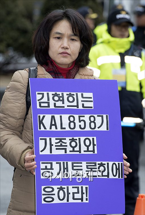 [아시아경제 윤동주 기자] KAL858기 가족회가 22일 오전 서울 종로구 삼청동 인수위원회 앞에서 'KAL858기 사건 진상규명' 을 촉구하는 기자회견을 갖고 있다.