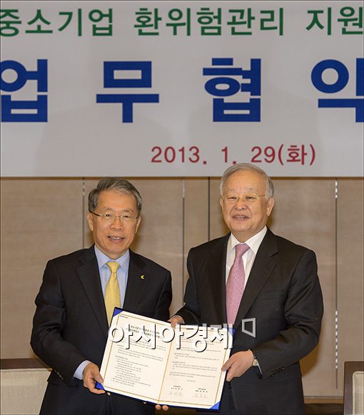 [아시아경제 윤동주 기자] 29일 서울 중구 남대문로 대한상공회의소에서 손경식(오른쪽) 대한상의 회장과 윤용로 외환은행장이 '중소기업 환위험관리 지원을 위한 업무협약식'을 마친 후 포즈를 취하고 있다. 대한상의와 외환은행은 최근 환율 변동으로 어려움을 겪는 기업들을 위해 환위험 관리 상품정보 제공, 환율 교육 및 상담, 수출입 거래시 수수료 할인 등을 추진하기로 했다.