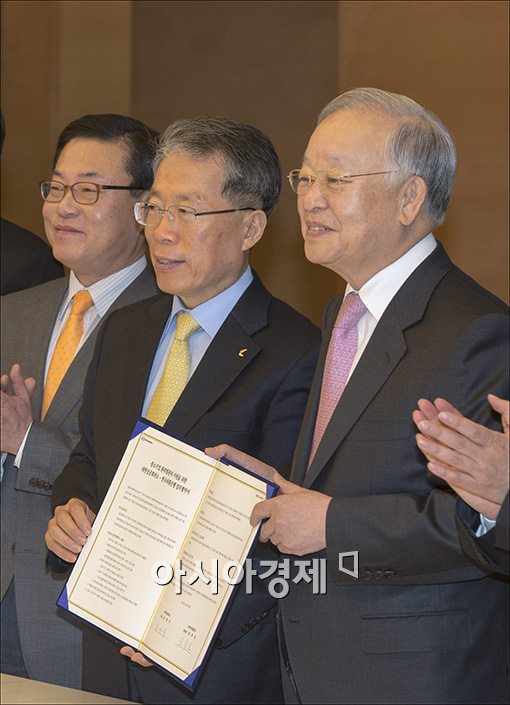 [아시아경제 윤동주 기자] 29일 서울 중구 남대문로 대한상공회의소에서 손경식 대한상의 회장과 윤용로 외환은행장이 '중소기업 환위험관리 지원을 위한 업무협약식'을 마친 후 포즈를 취하고 있다. 대한상의와 외환은행은 최근 환율 변동으로 어려움을 겪는 기업들을 위해 환위험 관리 상품정보 제공, 환율 교육 및 상담, 수출입 거래시 수수료 할인 등을 추진하기로 했다.