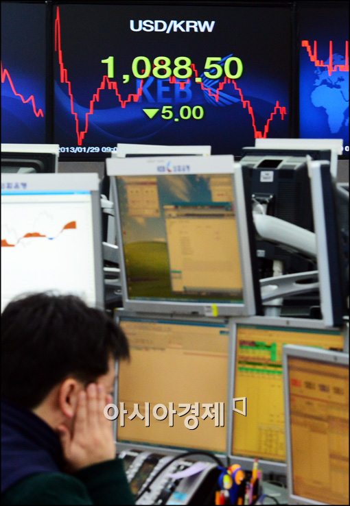 [아시아경제 최우창 기자]달러-원 환율은 내림세를 보이고 코스피 지수는 상승한 29일 서울 을지로 외환은행 본점 딜링룸에서 딜러들이 모니터 환율 움직임을 살.