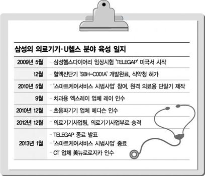 이와는 별개로 삼성은 초음파기기의 강자인 메디슨, 최근엔 컴퓨터단층촬영(CT) 업체인 미국 뉴로로지카도 인수했다. 5대 신사업 중 하나인 의료기기를 원격의료 분야와 대형 진단기기로 나눠 육성하려는 의지로 풀이된다.
