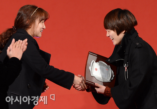 [아시아경제 정재훈 기자] 강초현이 31일 오전 서울 하얏트호텔에서 열린 '제18회 코카-콜라 체육대상 시상식'에서 시상자로 나서 신인상을 수상한 사격 김장미에게 상패를 전달하고 있다.