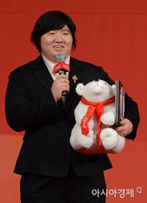 [아시아경제 정재훈 기자] 31일 오전 서울 하얏트호텔에서 열린 '제18회 코카-콜라 체육대상 시상식'에서 공로상을 수상한 장미란이 소감을 밝히고 있다.