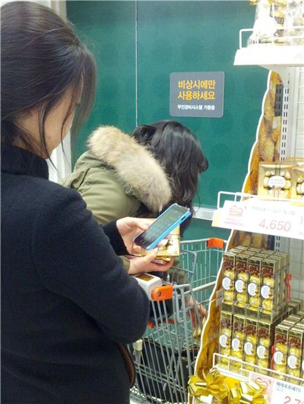 ▲밸런타인데이 하루 전인 13일 저녁, 용산 이마트에서 한 여성이 페레로로쉐 매대 앞에서 휴대폰으로 계산기를 두드리고 있다. 개당 가격을 따져 더 저렴한 것을 구입하기 위해서다.