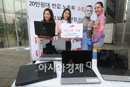 [아시아경제 백소아 기자] 18일 서울 청계천 광장에서 오픈마켓 11번가가가 반값노트북 '쇼킹노트: 더 원'을 선보이고 있다. 11번가는 이날 11시부터 1300대의 노트북을 한정 판매한다.
