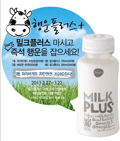 밀크플러스 넥택에 부착된 즉석 스크래치 복권을 긁으면 파리바게뜨 20만원 상품권, 해피콘 1만원권, 밀크플러스 750ml와 200ml 등 다양한 경품이 제공된다. 또 이벤트 기간 모든 구매 고객에게 해피포인트 더블적립 혜택도 주어진다.