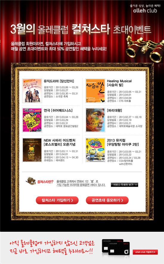 [아시아경제 심나영 기자]KT(회장 이석채)는 올레클럽 멤버십 회원중 컬쳐스타 가입고객을 대상으로 인기 문화 공연 서비스 혜택을 제공하는 '3월의 컬쳐스타 초대이벤트'를 31일까지 진행한다고 17일 밝혔다.