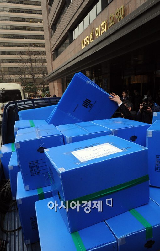 [아시아경제 백소아 기자] 서울중앙지검 금융조세조사1부가 외환은행 본점 압수수색을 들어간 가운데 19일 서울 중구 외환은행 본점에서 검찰관계자들이 압수물을 들고 나오고 있다. 서울중앙지검 금융조세조사1부는 론스타가 대주주로 있던 시절 외환은행이 대출 가산금리를 부당하게 인상한 것과 관련해 압수수색을 진행했다.