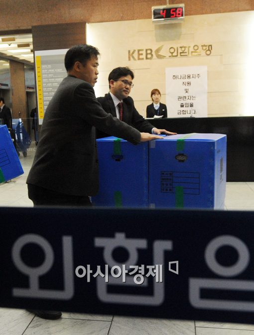 [아시아경제 백소아 기자] 서울중앙지검 금융조세조사1부가 외환은행 본점 압수수색을 들어간 가운데 19일 서울 중구 외환은행 본점에서 검찰관계자들이 압수물을 들고 나오고 있다. 서울중앙지검 금융조세조사1부는 론스타가 대주주로 있던 시절 외환은행이 대출 가산금리를 부당하게 인상한 것과 관련해 압수수색을 진행했다.