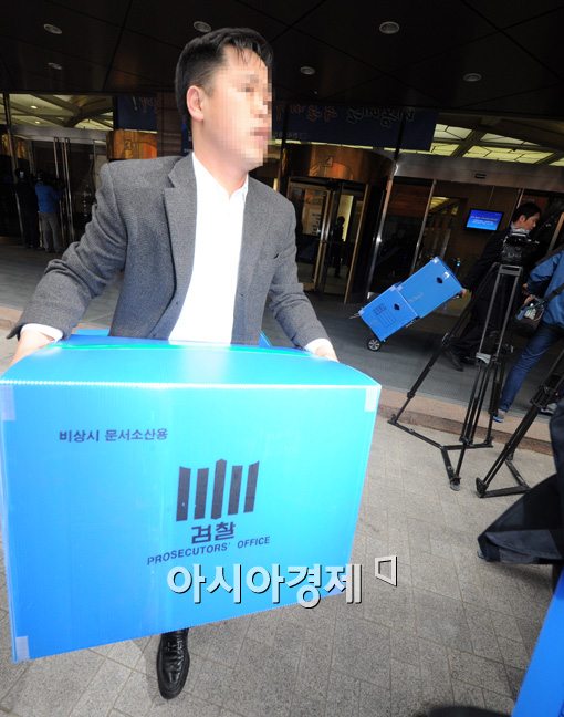 [아시아경제 백소아 기자] 서울중앙지검 금융조세조사1부가 외환은행 본점 압수수색을 들어간 가운데 19일 서울 중구 외환은행 본점에서 검찰관계자들이 압수물을 들고 나오고 있다. 서울중앙지검 금융조세조사1부는 론스타가 대주주로 있던 시절 외환은행이 대출 가산금리를 부당하게 인상한 것과 관련해 압수수색을 진행했다.