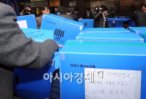 [아시아경제 백소아 기자] 서울중앙지검 금융조세조사1부가 외환은행 본점 압수수색을 들어간 가운데 19일 서울 중구 외환은행 본점에서 검찰관계자들이 압수물을 싣고 있다. 서울중앙지검 금융조세조사1부는 론스타가 대주주로 있던 시절 외환은행이 대출 가산금리를 부당하게 인상한 것과 관련해 압수수색을 진행했다.