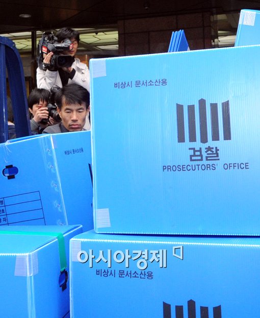 [아시아경제 백소아 기자] 서울중앙지검 금융조세조사1부가 외환은행 본점 압수수색을 들어간 가운데 19일 서울 중구 외환은행 본점에서 검찰관계자들이 압수물을 싣고 있다. 서울중앙지검 금융조세조사1부는 론스타가 대주주로 있던 시절 외환은행이 대출 가산금리를 부당하게 인상한 것과 관련해 압수수색을 진행했다.