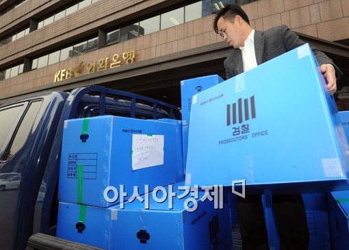 [아시아경제 백소아 기자] 서울중앙지검 금융조세조사1부가 외환은행 본점 압수수색을 들어간 가운데 19일 서울 중구 외환은행 본점에서 검찰관계자들이 압수물을 싣고 있다. 서울중앙지검 금융조세조사1부는 론스타가 대주주로 있던 시절 외환은행이 대출 가산금리를 부당하게 인상한 것과 관련해 압수수색을 진행했다.