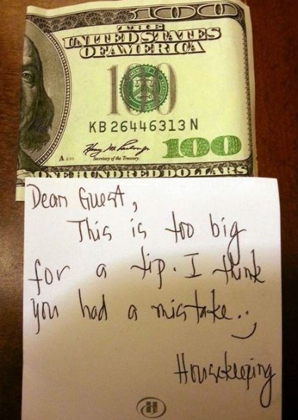 사진은 미화 100달러와 작은 쪽지가 담겨 있다. 쪽지에는 "손님, 이건 팁으로 받기엔 너무 큰 액수네요. 실수로 주신 것 같아요 - 하우스 키퍼"라는 메시지가 적혀 있어 눈길을 끈다.