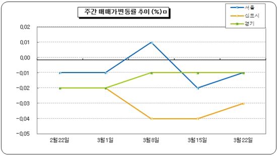 수도권 시장 분위기 역시 냉랭하다. 전주 대비 아파트값 변동률은 경기가 -0.01%, 신도시는 -0.03% 인천은 0.00%다.