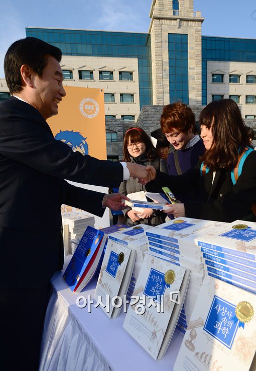 [아시아경제 백소아 기자] 29일 서울 성동구 한양대학교에서 열린 '책으로 하나 되는 한양 새내기'행사에서 임덕호 한양대 총장이 신입생들에게 책을 나눠주고 있.