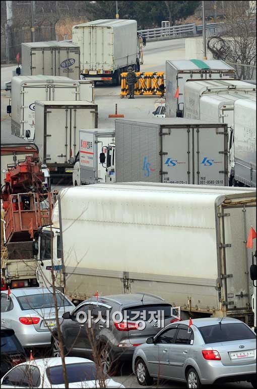 [파주=아시아경제 최우창 기자]북한이 개성공단 폐쇄 가능성을 언급한 가운데 1일 경기도 파주시 경의선 남북출입사무소에서 개성공단 차량이 출경하고 있다.
