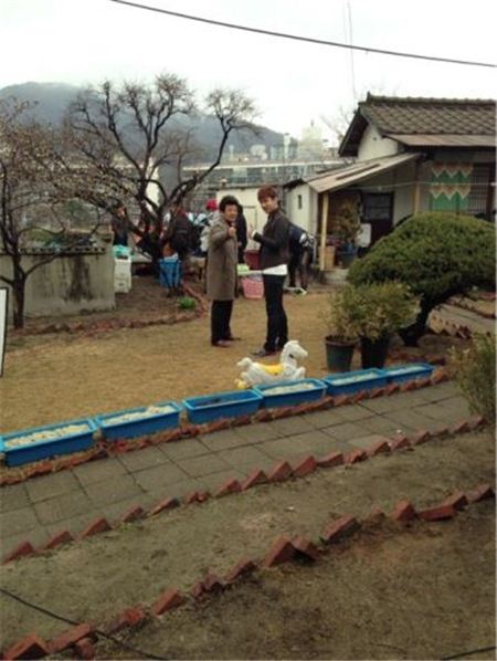 사진 속 권현상은 야왕 촬영현장에서 성지루와 함께 엄지손가락을 치켜세운 포즈를 취하고 있다.