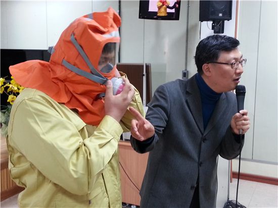 이날 교육에서는 전문강사를 초빙해 방독면 착용 및 사용요령, 화생방 사태 발생 시 대피요령, 대체장비·물자 사용요령 등 체험실습 위주의 훈련을 실시했다.