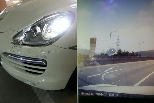 사진 속에는 차량 왼쪽 전조등이 깨지고 앞범퍼에 쓸린 자국이 남는 등 파손 부위가 비교적 선명하게 드러나 있다. 블랙박스 영상 캡쳐에서는 정체불명의 금속 파편이 신지의 차량 앞으로 날아오는 모습을 볼 수 있다.