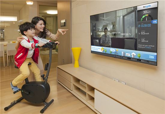 TV로 자전거 게임과 운동을 동시에 즐긴다