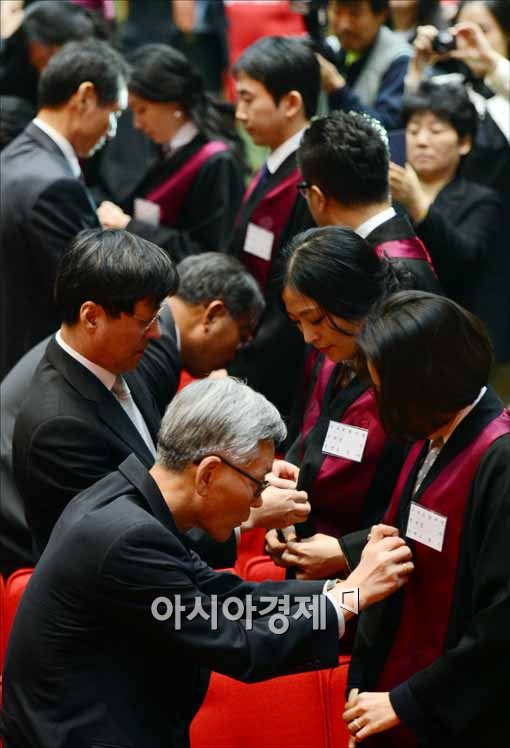 [과천=아시아경제 최우창 기자]신임검사 임관식이 6일 오후 경기도 정부과천청사 대강당에서 열린 가운데 신임검사들이 가족들로부터 법복을 입고 있다.