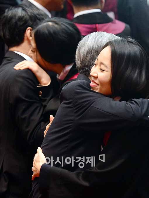 [과천=아시아경제 최우창 기자]신임검사 임관식이 6일 오후 경기도 정부과천청사 대강당에서 열린 가운데 법복을 입은 신임검사들이 가족들과 포옹을 하고 있다.
