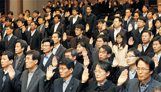 ▲지난해 2월 28일 서울 종로구 수송동 국세청사에서 열린 '숨긴재산 무한추적팀' 발대식에서 팀원들이 불법 은닉재산을 끝까지 추적해 공정세정을 구현하겠다는 내용의 선서를 하고 있다.