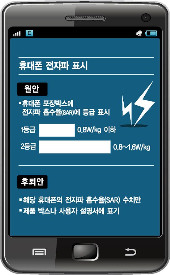 휴대폰 포장박스에 1등급, 2등급으로 전자파 강도를 쉽게 알아볼 없어