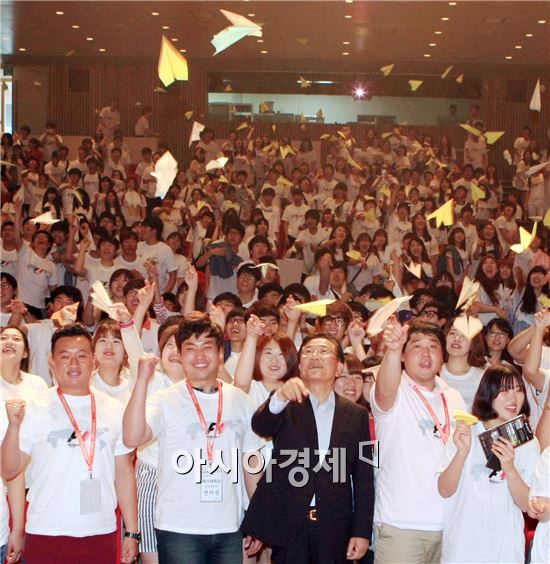 ‘2013 F1 코리아 그랑프리 홍보를 위한 대학생 F1 서포터즈 발대식’이 3일 오후 도청 김대중 강당에서 열린 가운데 박준영 전남도지사를 비롯해 광주ㆍ전남 11개 대학교 대학생 800명의 서포터즈들이 F1 대회 성공을 다짐하며 종이비행기 날리기 퍼포먼스를 하고 있다.