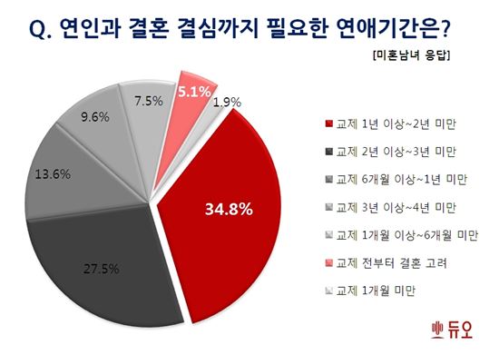 이 결과 ‘결혼을 고려하고 결심하기까지 필요한 연애기간’에 대해 3명 중 1명꼴인(34.8%)가 ‘교제 1년 이상~2년 미만’이라고 답해 가장 많은 비중을 차지했다.