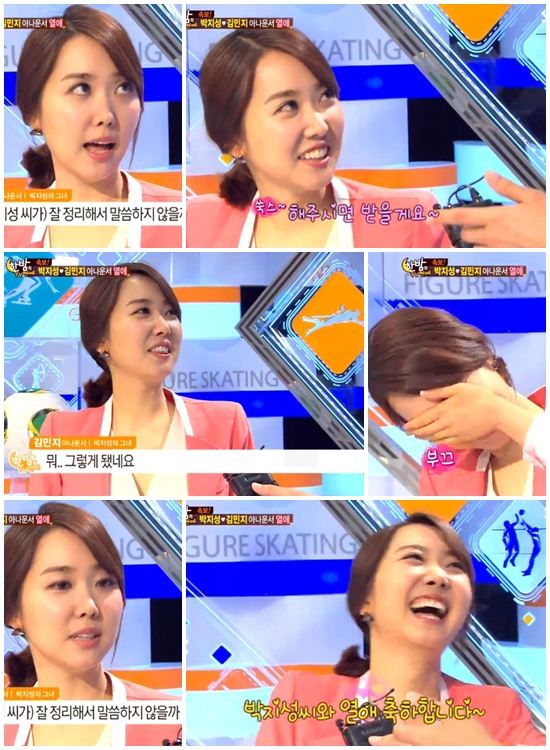 김민지 아나운서는 김일중 아나운서가 “축하해줘도 되냐?”라고 재차 질문하자 “축하해주시면 받겠다”라고 열애 사실을 인정했다.