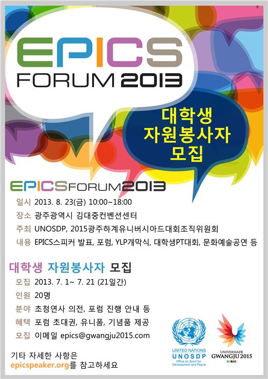 2015광주하계유니버시아드대회 조직위원회는 오는 8월 광주에서 개최되는 ‘2013 에픽스(EPICS) 포럼’의 자원봉사자 모집에 나섰다.