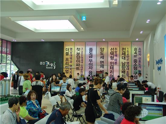 [아시아경제 박미주 기자]한국토지신탁이 4일 개관한 경북 경산 신대부적지구 '경산 코아루' 아파트 견본주택에 오전에만 2000여명의 방문객이 몰렸다.