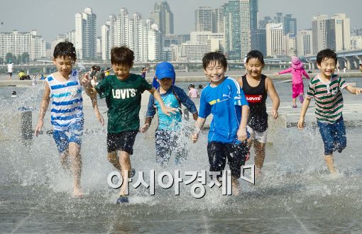 [아시아경제 최우창 기자]장마가 소강상태를 보인 24일 서울 여의도 물빛광장에서 어린이들이 모처럼 물놀이를 즐기고 있다.